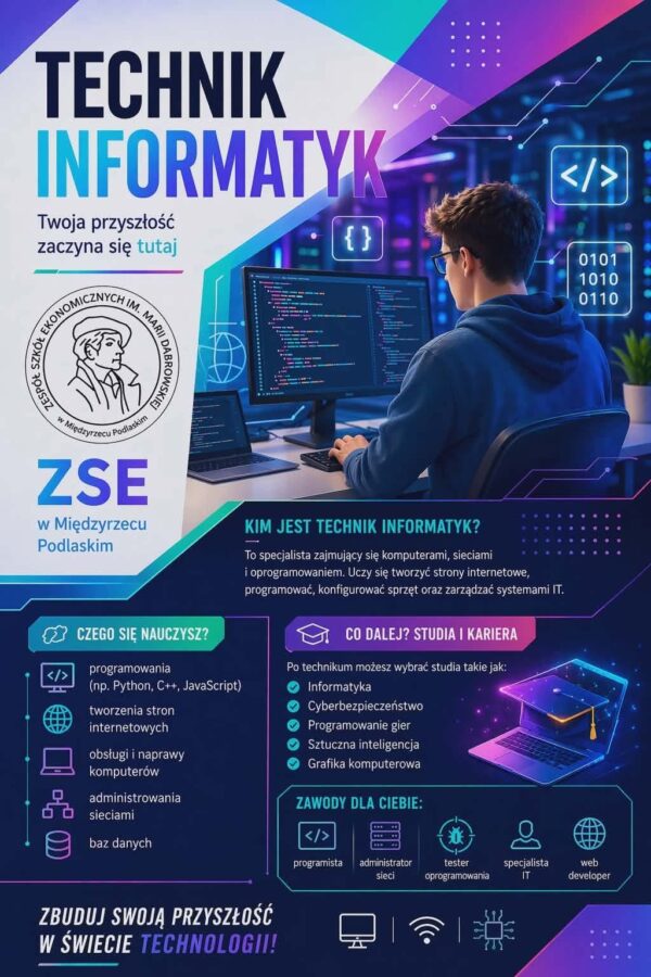 Technik informatyk – kierunek zapewniający kompleksową wiedzę z zakresu technologii komputerowych, baz danych oraz sieci komputerowych. Program kształcenia został dostosowany do zapotrzebowania rynku pracy na wykwalifikowanych młodych pracowników posiadających szeroki wachlarz umiejętności.