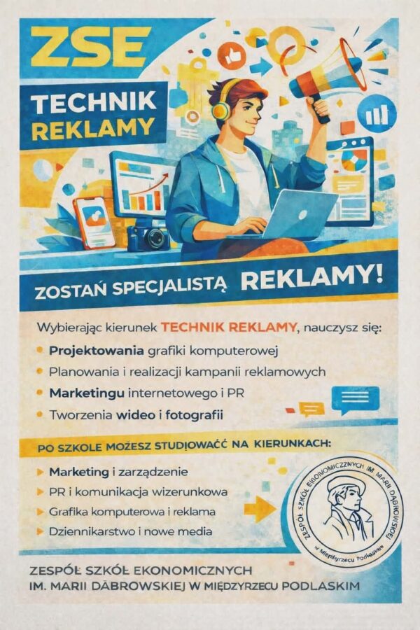 Jest to nowy kierunek powstały w celu dostosowania młodego człowieka do życia w warunkach zmieniającego się rynku pracy. Przygotowuje on ucznia do organizowania oraz prowadzenia sprzedaży produktów i usług reklamowych. Ponadto absolwent posiada kwalifikacje do organizowania i prowadzenia kampanii reklamowych, projektowania oraz wykonywania reklamy w wersji drukowanej i elektronicznej. Uczeń zdobywa wiedzę z zakresu zasad funkcjonowania rynku finansowego, potrafi określić psychologiczne i socjologiczne uwarunkowania działalności reklamowej, opracować oraz zinterpretować wyniki badań rynku reklamy. Wiedza praktyczna zdobywana jest w doskonale wyposażonych pracowniach multimedialnych. Praktyka zawodowa w wymiarze 4 tygodni prowadzona jest w placówkach zajmujących się reklamą lub w podmiotach stanowiących potencjalne miejsca zatrudnienia absolwentów tej specjalności.