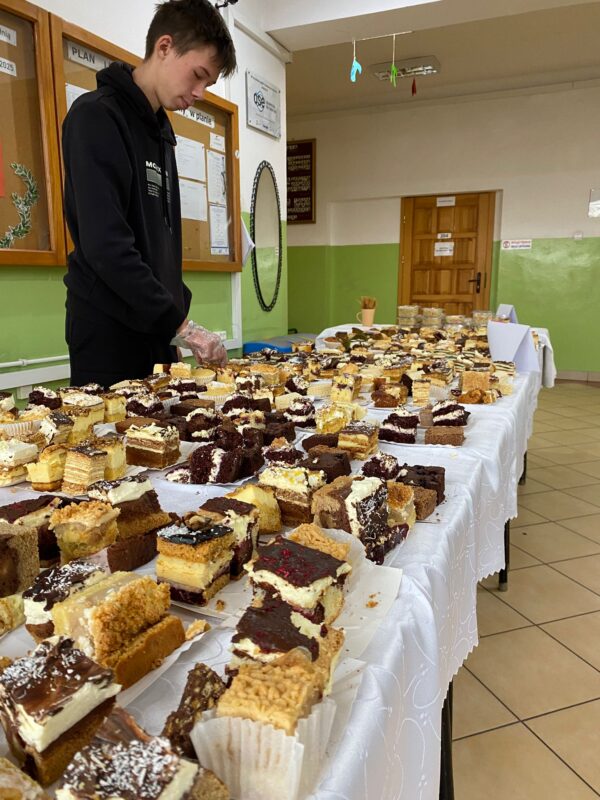 Społeczność naszej szkoły wielokrotnie pokazała, że warto pomagać. W dniach 26 -27 listopada 2025 roku odbył się kiermasz charytatywny. Pozyskane środki zostały przekazane rodzinie, która obecnie zmaga się z trudną sytuacją. Zebrano kwotę 2750 zł. Dziękujemy wszystkim zaangażowanym za wrażliwe serca. Ciasta i sałatki bardzo smakowały kupującym. To była kolejna lekcja empatii i otwartości na potrzeby innych.