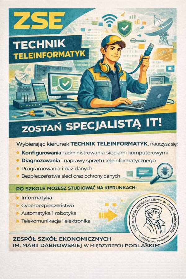 🔷🔸CZAS ZAPOZNAĆ SIĘ Z OFERTĄ KIERUNKÓW KSZTAŁCENIA W ZSE NA NOWY ROK SZKOLNY 2026/2027 🔸🔷 PROPOZYCJA NR 3 : TECHNIK TELEINFORMATYK Edukacja w zawodzie technik teleinformatyk umożliwi przygotowanie absolwenta do wykonywania następujących Wiecej...