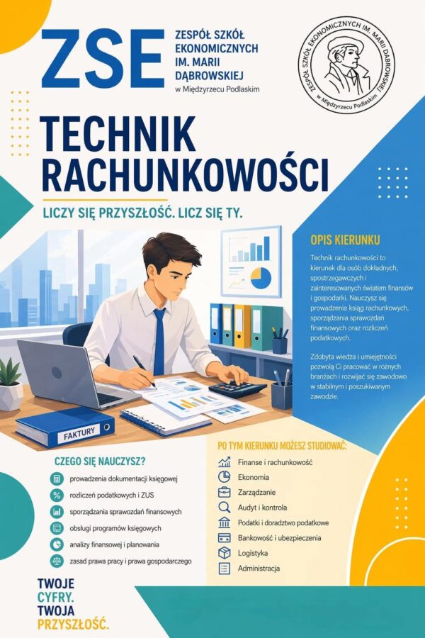 🔷🔸 CZAS ZAPOZNAĆ SIĘ Z OFERTĄ KIERUNKÓW KSZTAŁCENIA W ZSE NA NOWY ROK SZKOLNY 2026/2027 🔸🔷 PROPOZYCJA NR 5 : TECHNIK RACHUNKOWOŚCI Technik rachunkowości jest przygotowany do prowadzenia rachunkowości w jednostce organizacyjnej; potrafi Wiecej...