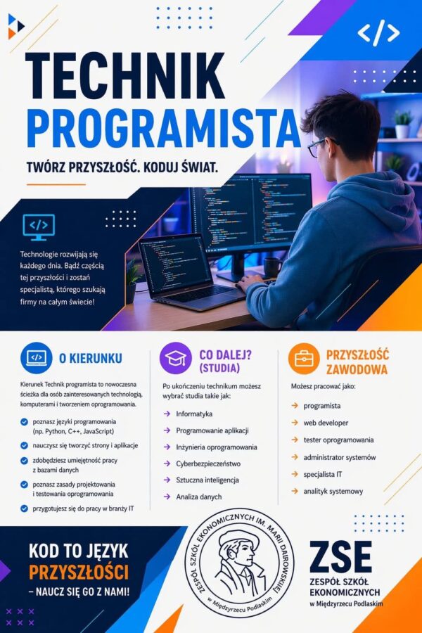 🔷🔸CZAS ZAPOZNAĆ SIĘ Z OFERTĄ KIERUNKÓW KSZTAŁCENIA W ZSE NA NOWY ROK SZKOLNY 2026/2027🔸🔷 PROPOZYCJA NR 7 : TECHNIK PROGRAMISTA Programista, developer – jest to osoba, która tworzy programy i aplikacje komputerowe, Wiecej...